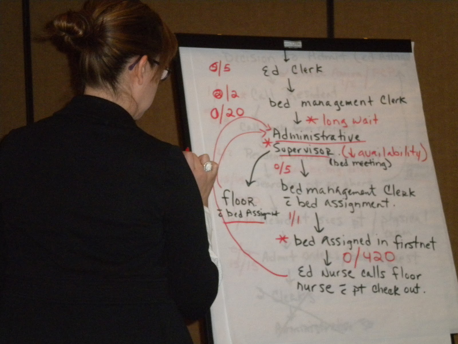 Here you see chief psychiatric resident Peggy Rodriguez keeping track as the group outlined the steps between when a decision is made to admit a patient and his or her arrival on a medical floor. Each discrete step is itemized, and two numbers are assigned. The one on the left is the net time for the task, and the one on the right is the gross time.